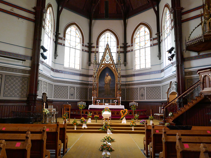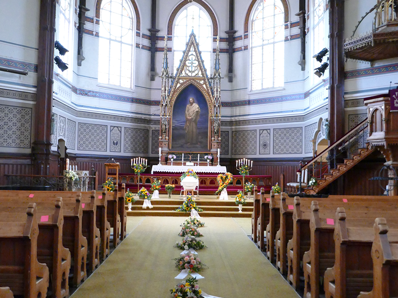 Kirken er av de største i byen, med sitteplass til ca 1.250 personer. Benkene er plassert i korsform på innsiden, slik at de bakerste fortsatt har god oversikt over det som skjer fremme i kirken. Kirken er dermed velegnet for begravelse eller bisettelse der man forventer svært mange gjester.