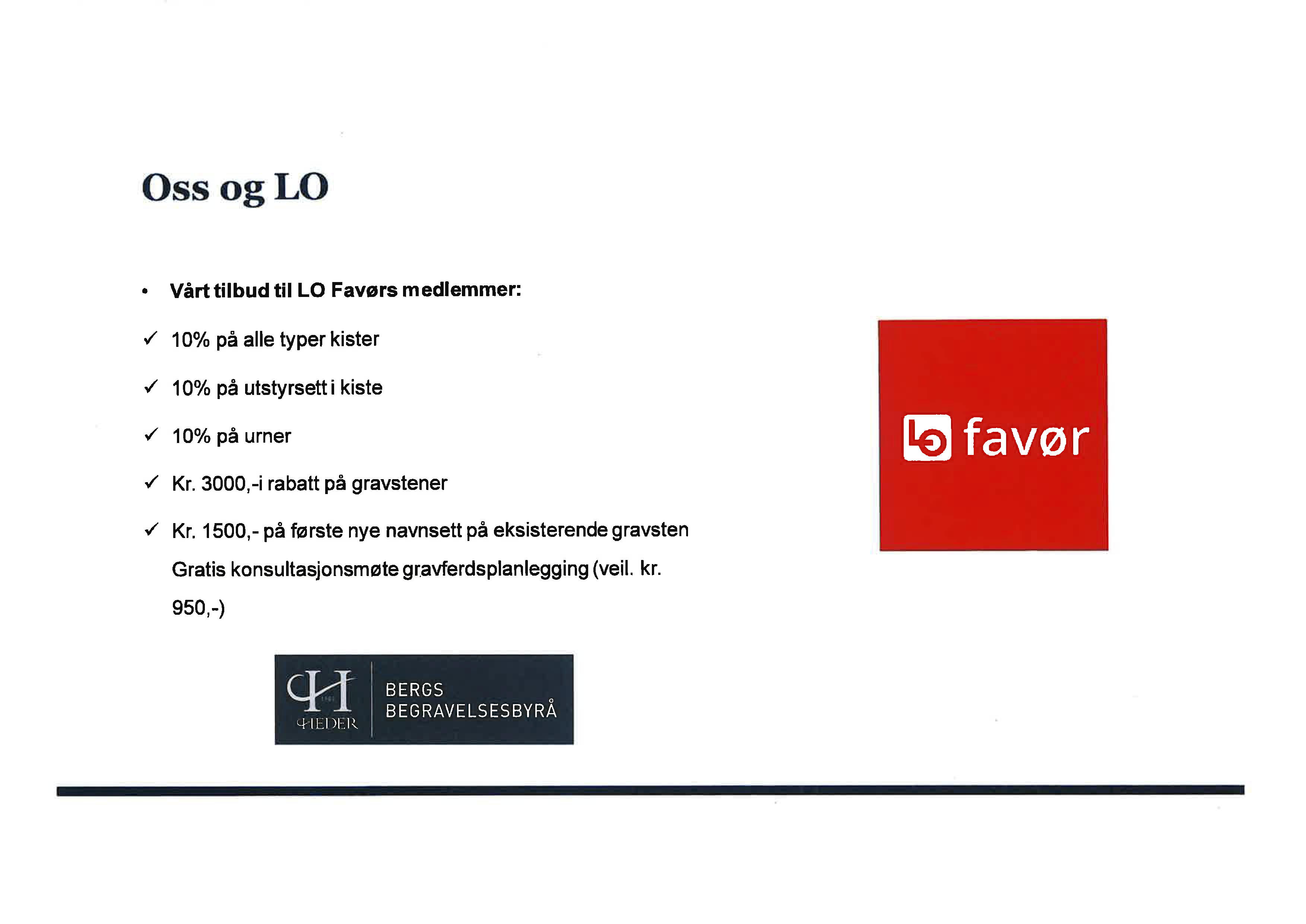 Vi er samarbeidspartner av LOfavør og tilbyr medlemsfordeler for deg som er medlem av et LO-forbund. Når et dødsfall inntreffer, ønsker de fleste å snakke med et begravelsesbyrå raskt. Spørsmålene er mange og mye skal avklares på kort tid. Som medlem får du fordeler hos oss: