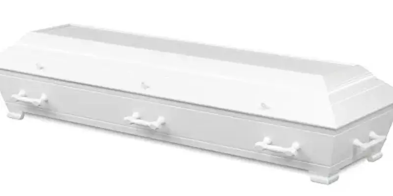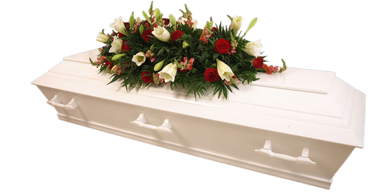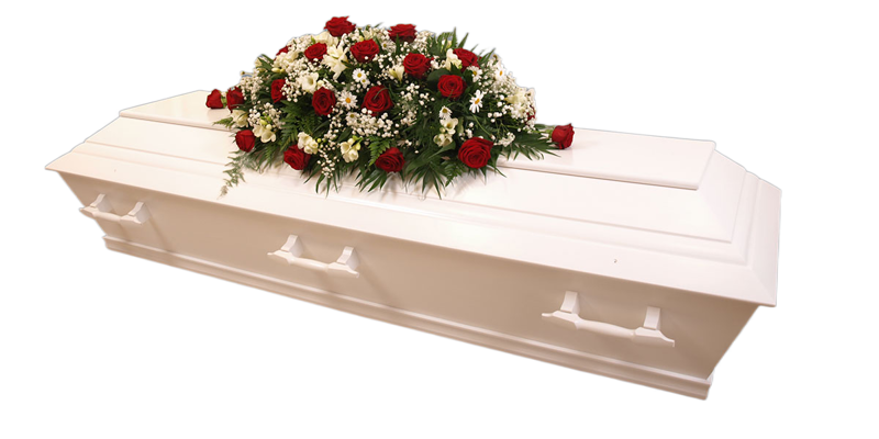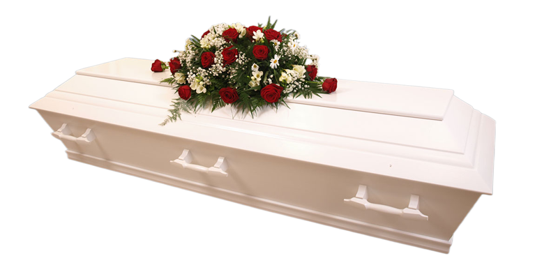 | • Hvit kiste og kistedekorasjon |