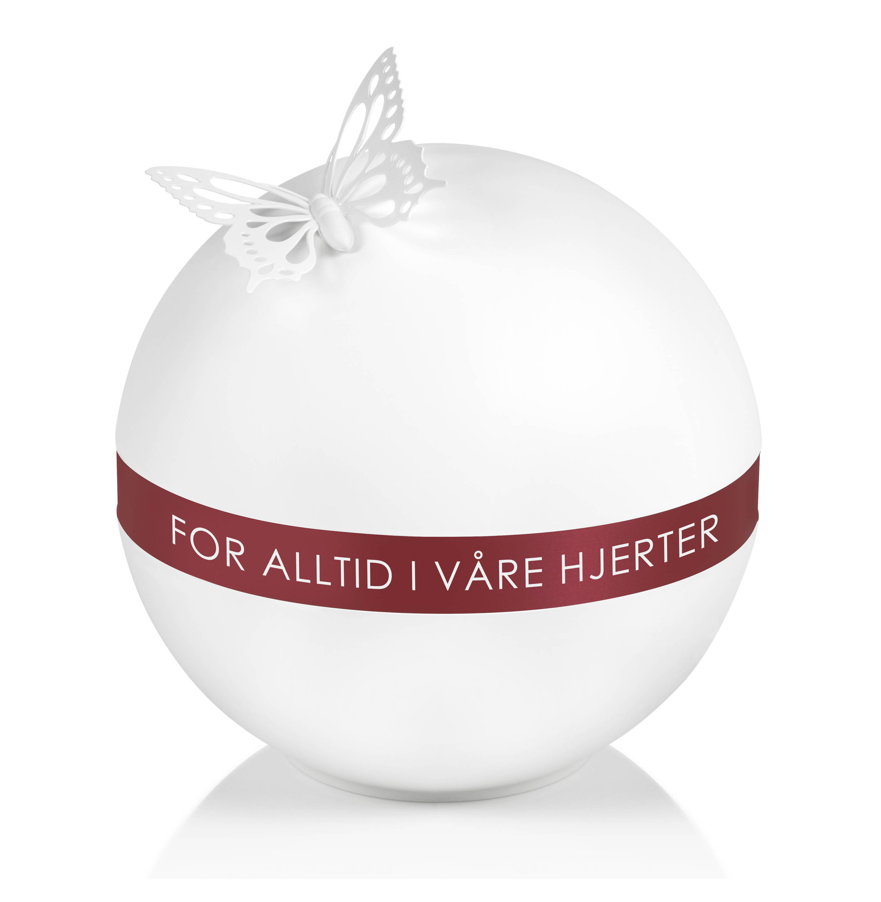 En personlig rund urne som er 100 % biologisk nedbrytbar. Med urnen følger et pent og vakkert avtagbart sommerfuglsymbol på en magnet som kan tas med hjem (det er mulig å bestille flere sommerfugler). På det elegante silkebåndet er det skrevet en siste hilsen med sølvfoliert tekst. Prisen på urnen er inkl sommerfugl + band med tekst.
