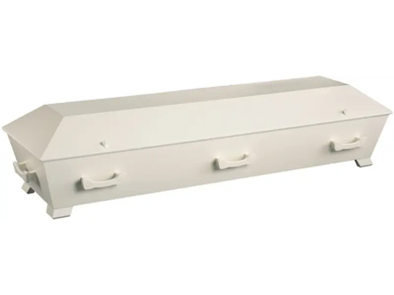Enkel hvit kiste tilvirket i sponplate, inkludert utstyr som pute og teppe
