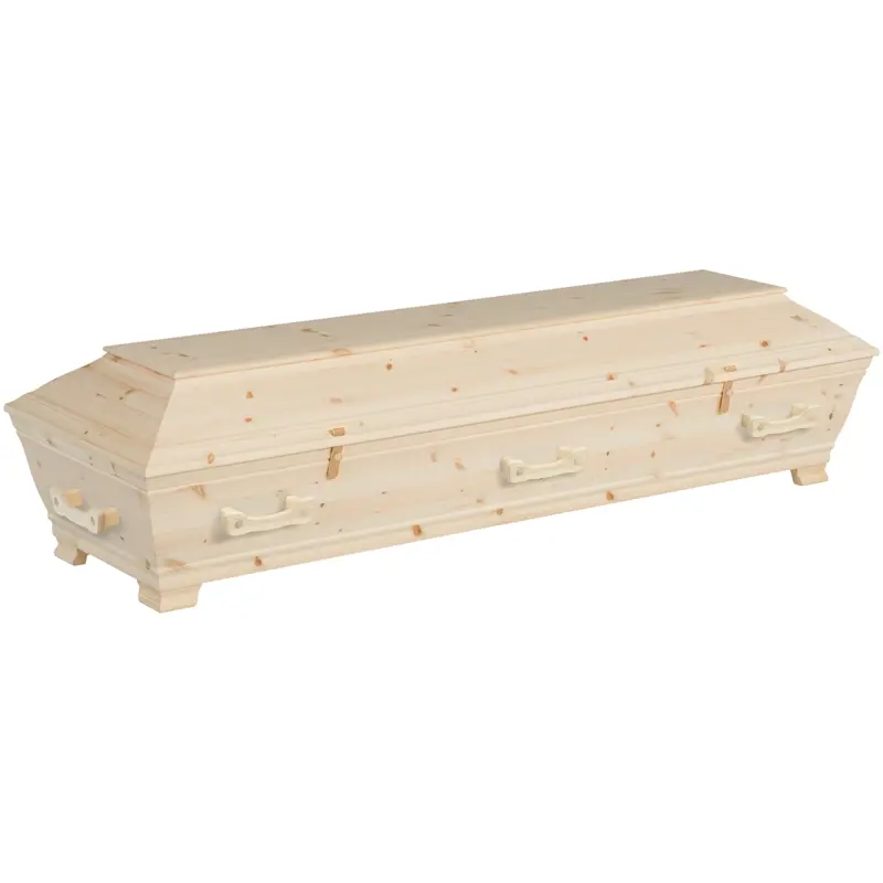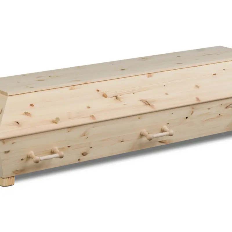 Stilfull, tradisjonell kiste i klarlakkert furu med botnplate av spon.