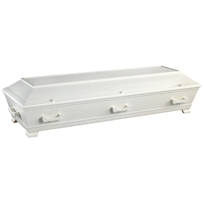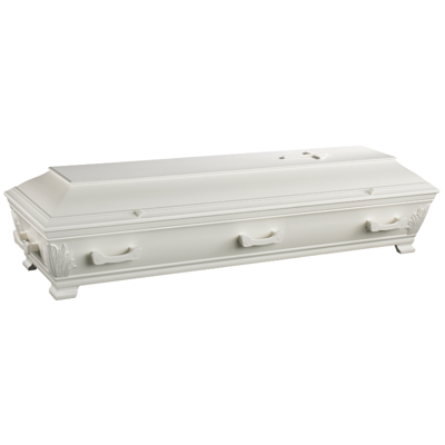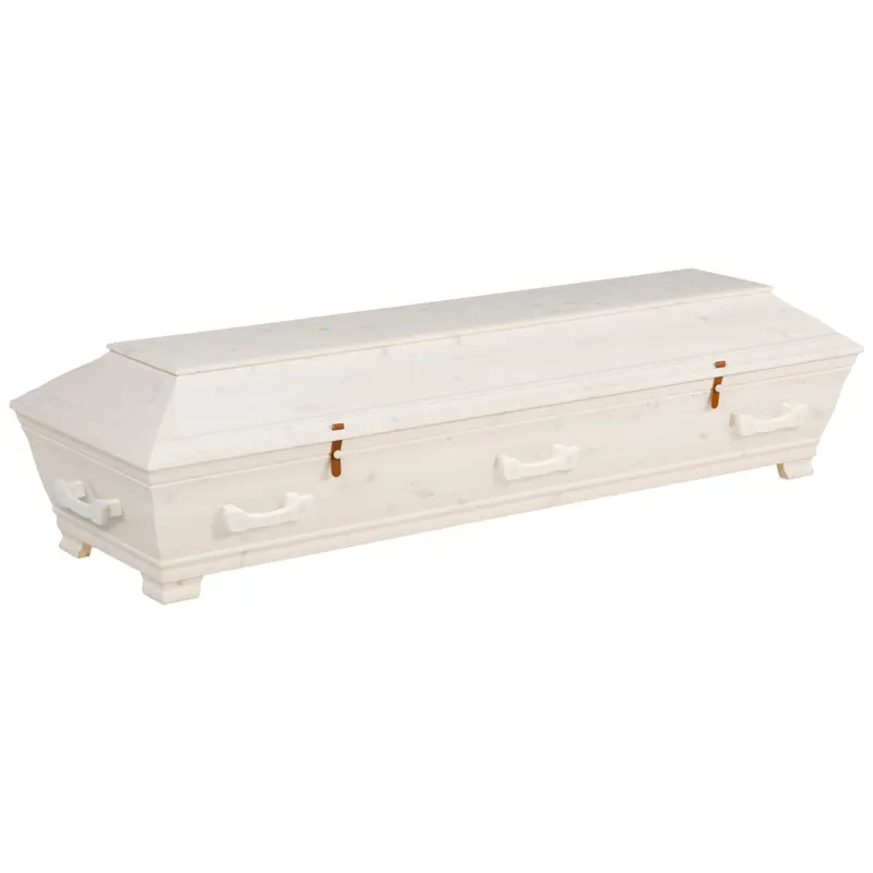 Vakker, klassisk kiste i kvitmalt furu. Forseggjort med fint interiør. Den er kledd i vakkert stoff, både innvendig i kista og innvendig i kistelokk. Denne kista vert ofte valgt ved open båre. Lilje-serien er våre mest brukte kistemodellar ved seremoniar.