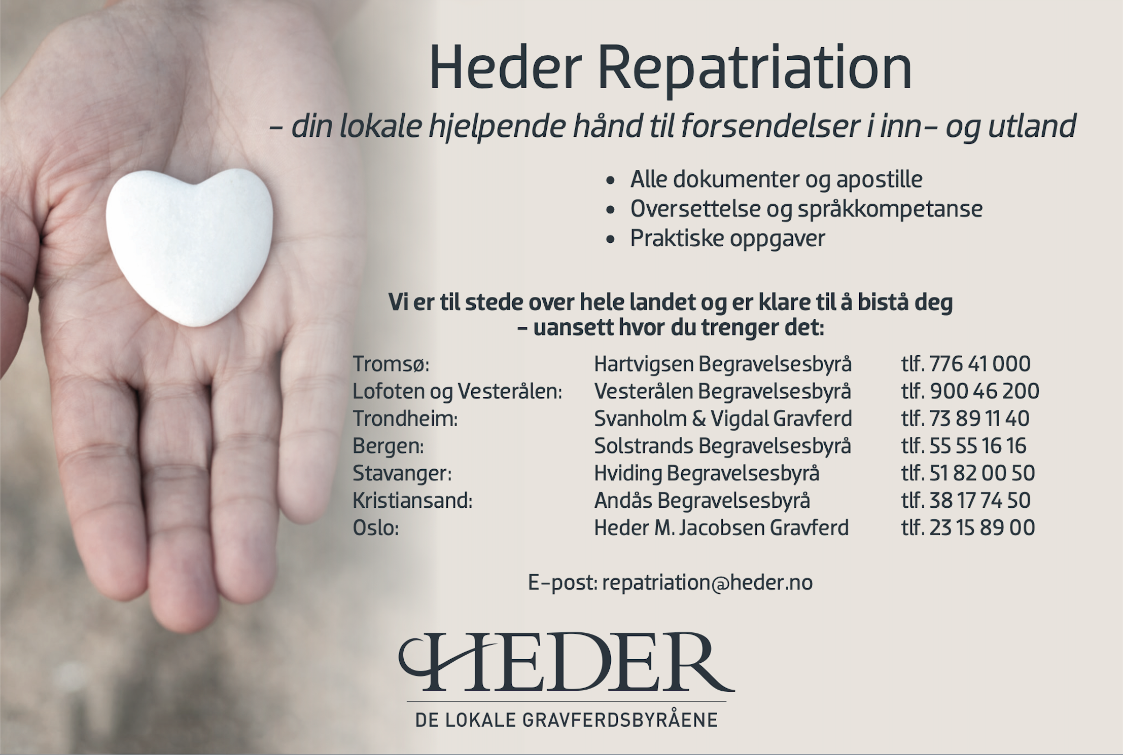 Vi samarbeider tett med begravelsesbyråer, forsikringsselskaper, transporttjenester og utenlandske krav og lover. Vi håndterer nødvendig papirarbeid for å sikre trygg transport over landegrenser. Vi koordinerer eventuell hjemtransport på en trygg og verdig måte.